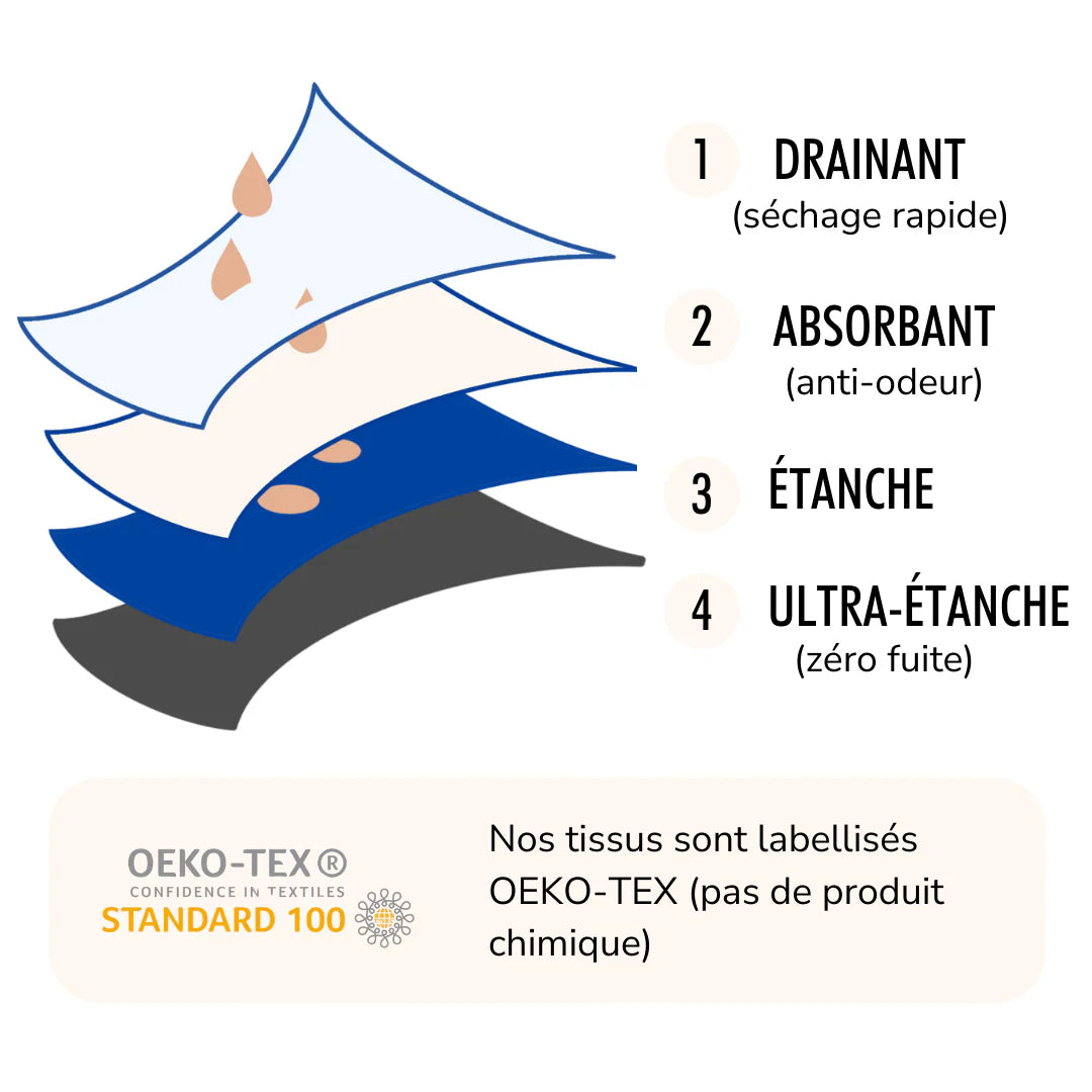 L’innovation de nos boxers se trouve dans leur doublure imperméable qui offre une absorption efficace et fiable pour vous accompagner dans toutes vos activités.